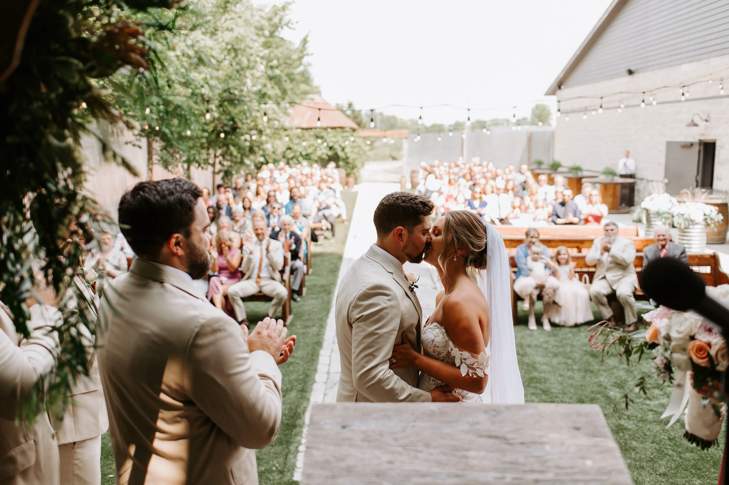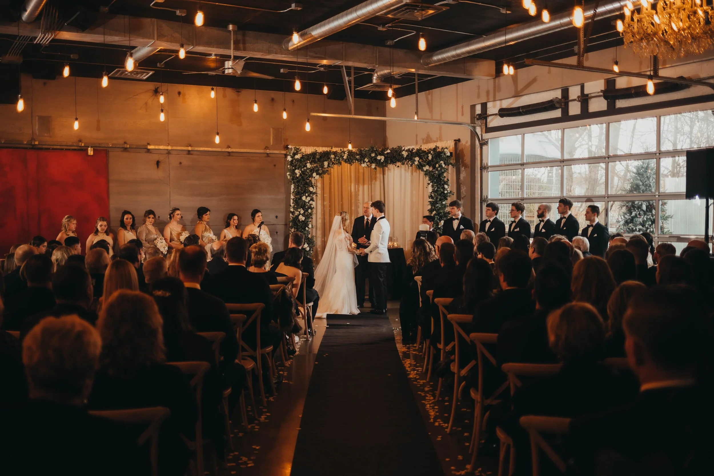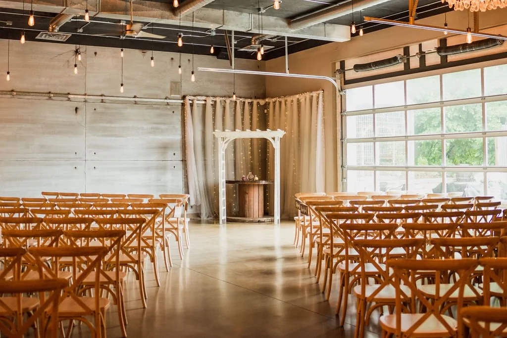 It may be worth holding off ten minutes to let a storm pass. Our team conducts a quick and thorough wipe down of the pews and benches and, like magic, an outdoor ceremony is back on track. It may be worth it to make the call early on. Our beautiful Industrial Rustic venue is the perfect indoor ceremony location and is filled with shimmering twinkle lights to bring a cozy and romantic vibe to your event.